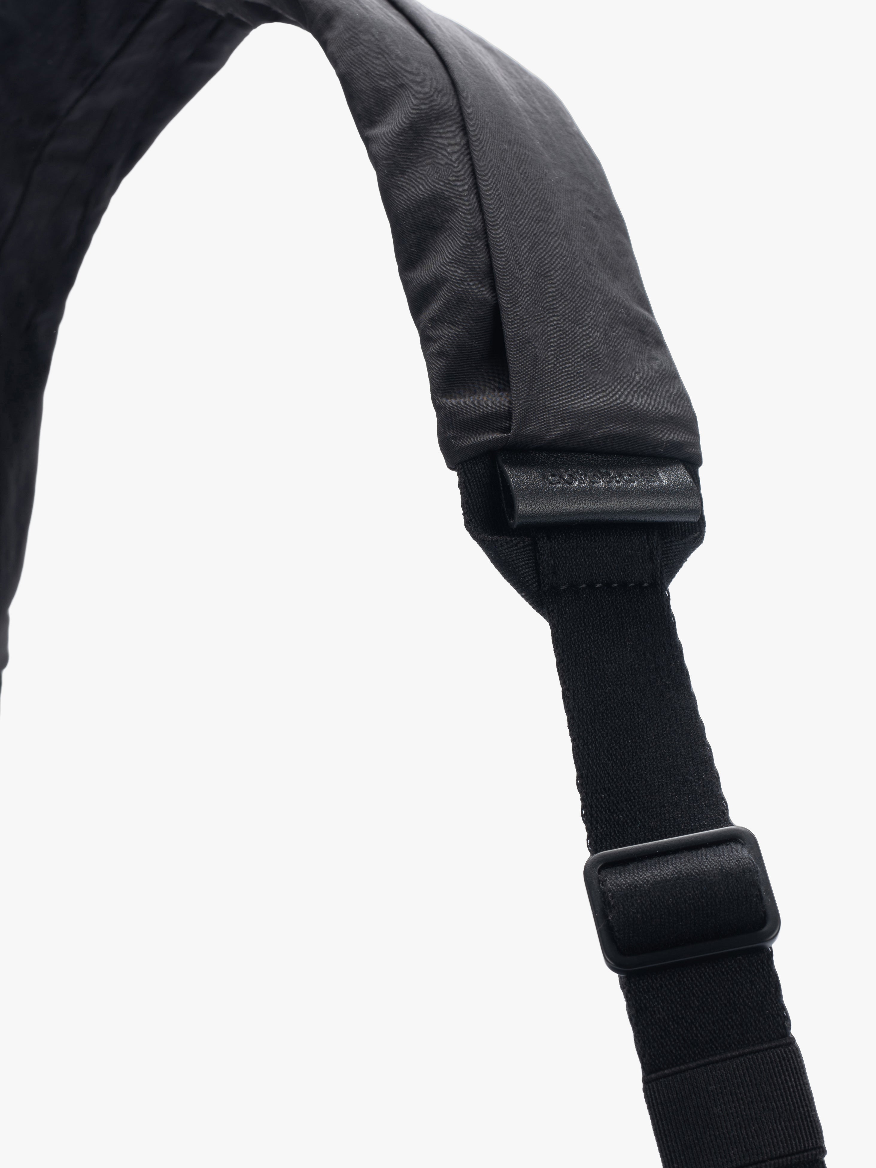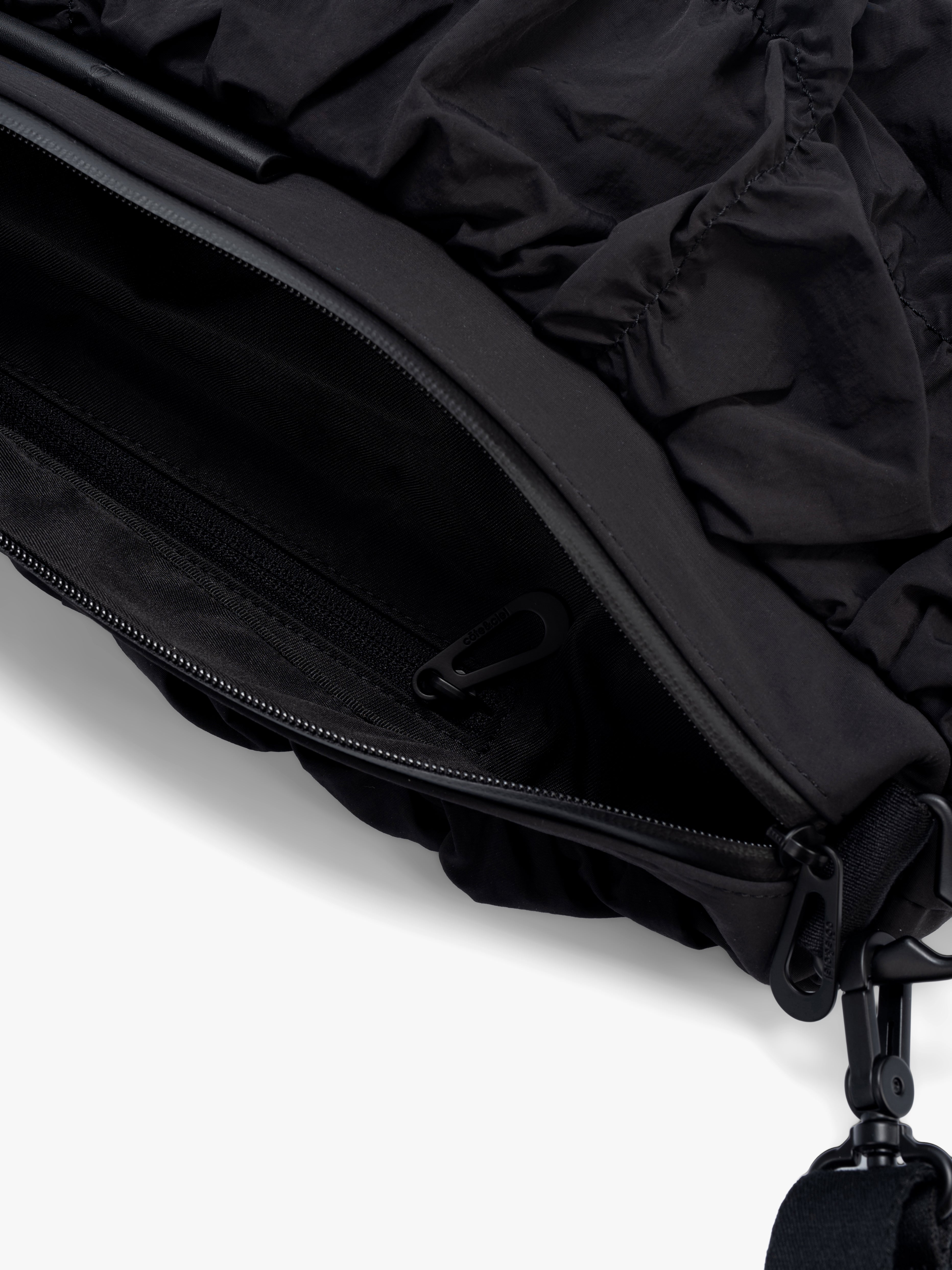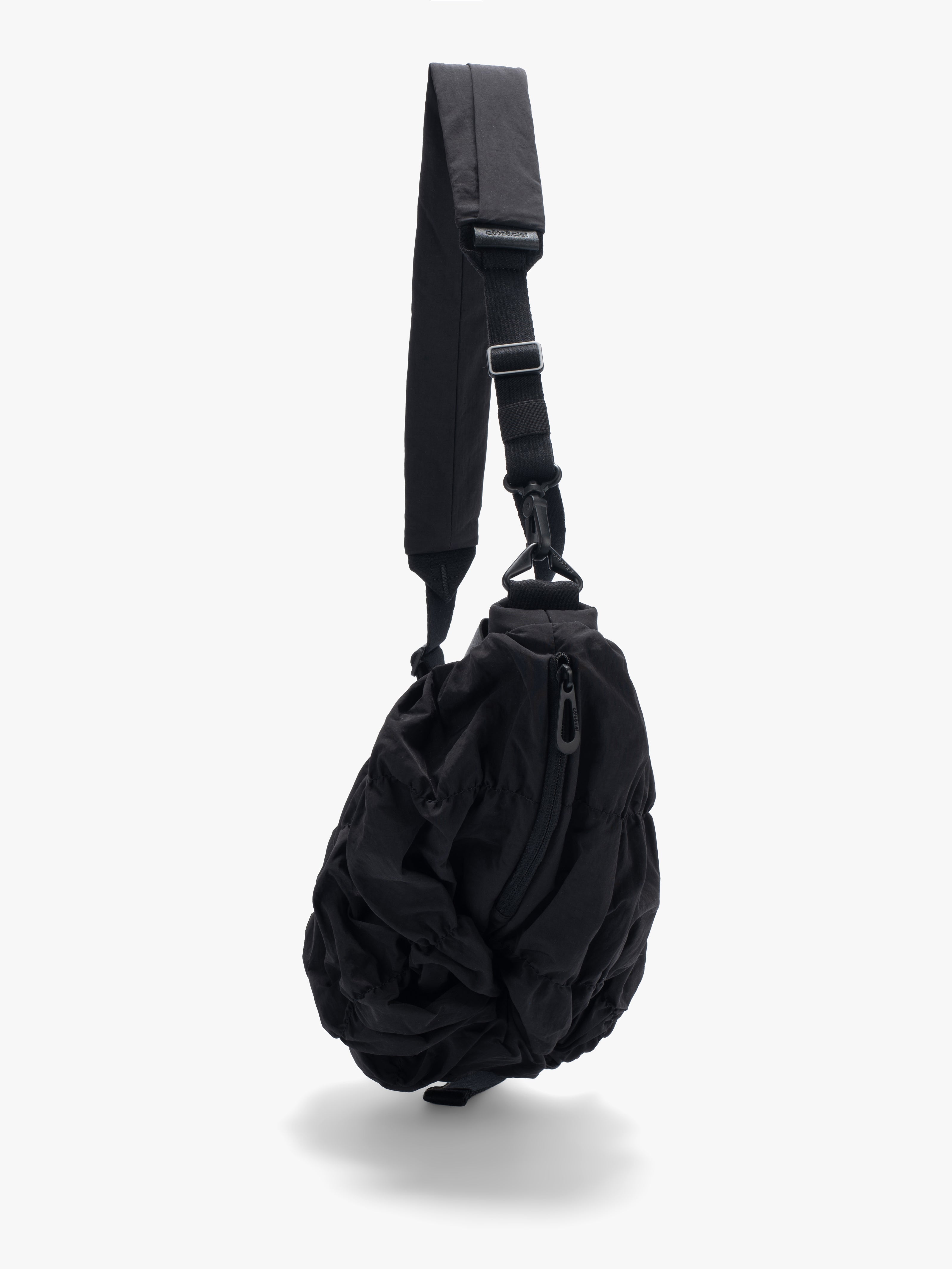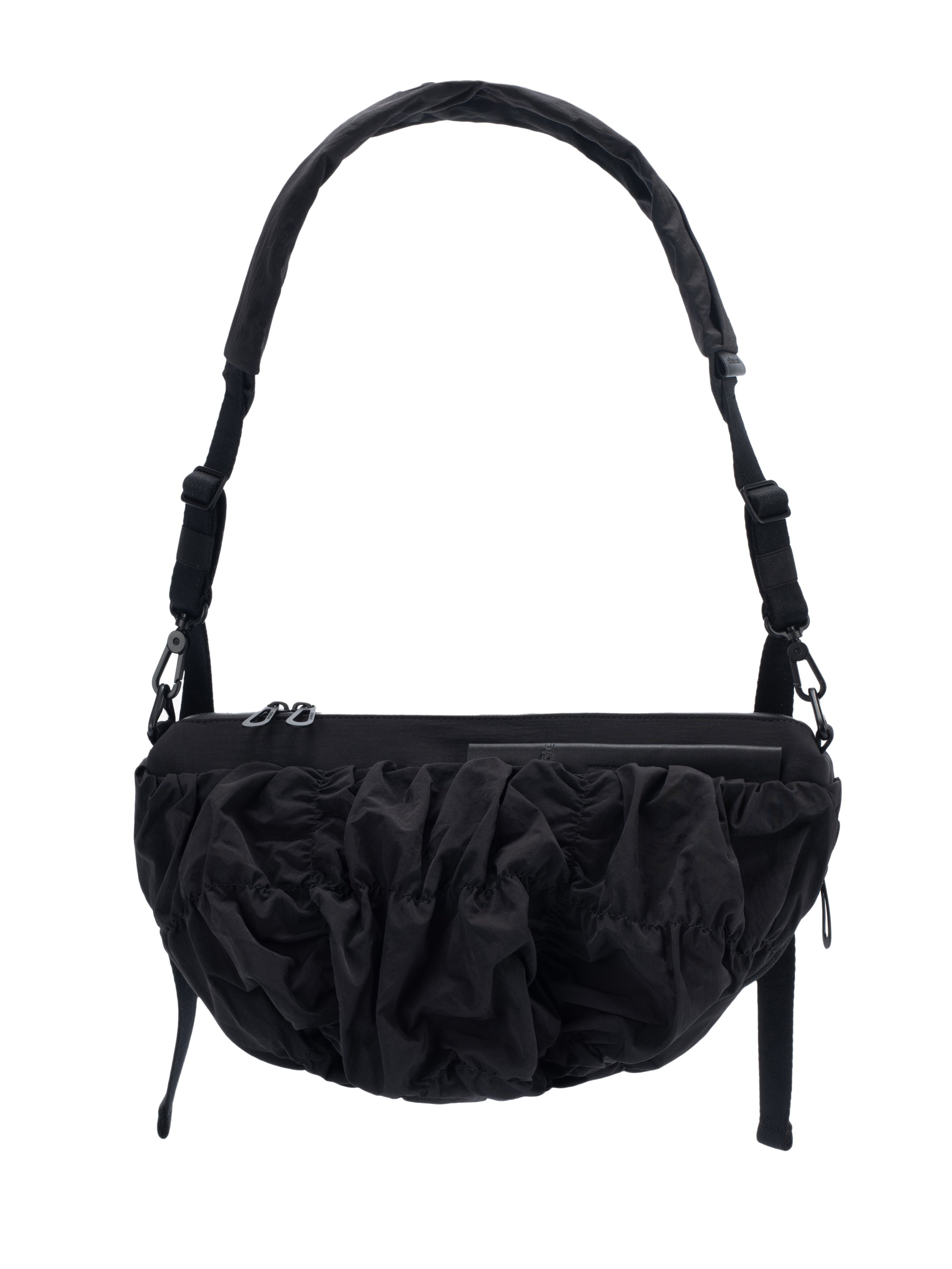 The Orne Otra Gathered is a fluid, sculptural bag designed to move naturally with the body. Crafted from softly folded black nylon, it creates a textured, dynamic silhouette with a subtle twist at the base for added dimension. The main compartment secures with a water-repellent zipper, while an external leather tag displays the embossed côte&ciel logo. The detachable ADDA shoulder strap allows the bag to be worn separately as a minimal crossbody, combining ergonomic functionality with modern, statement-making design.