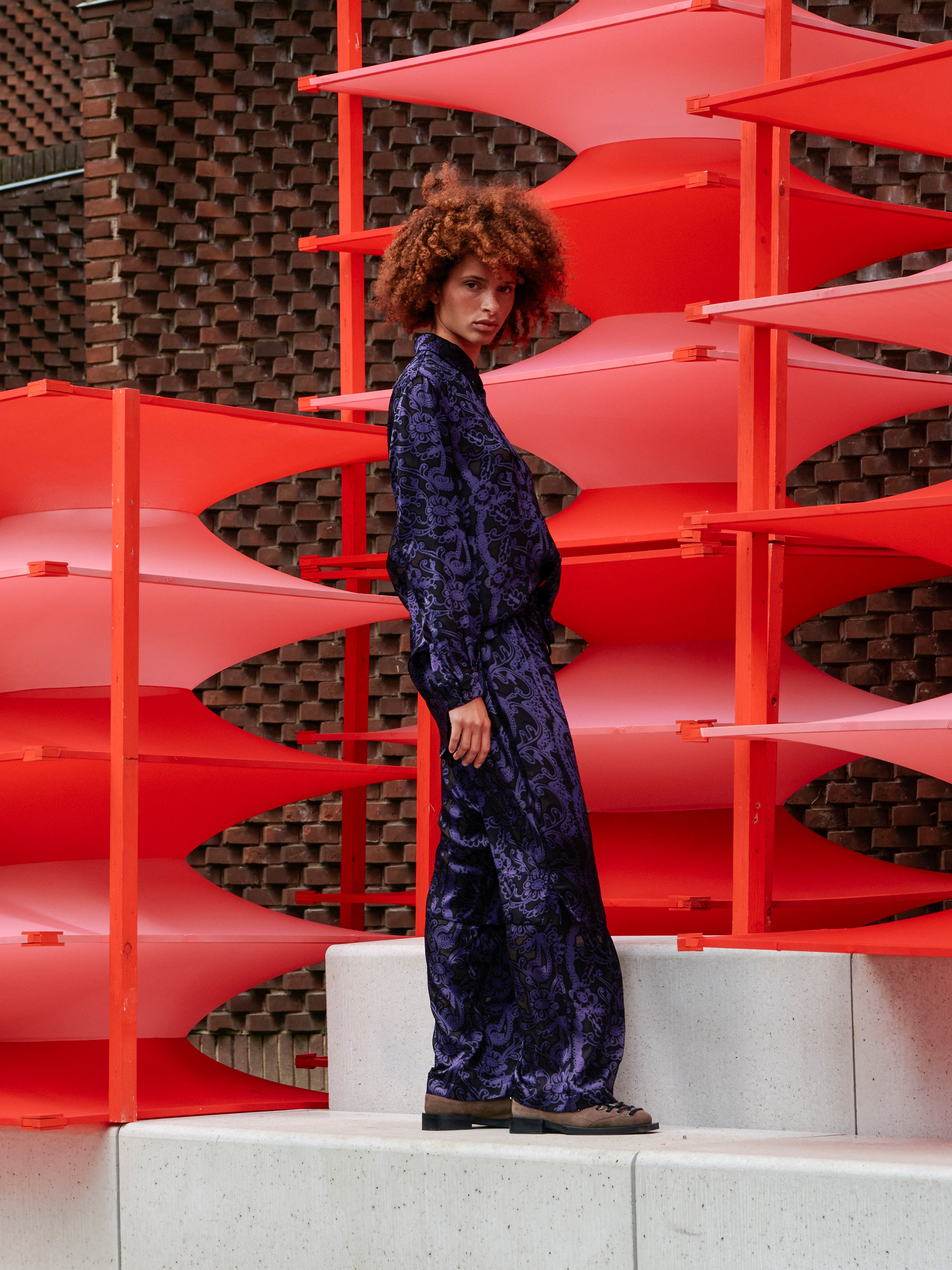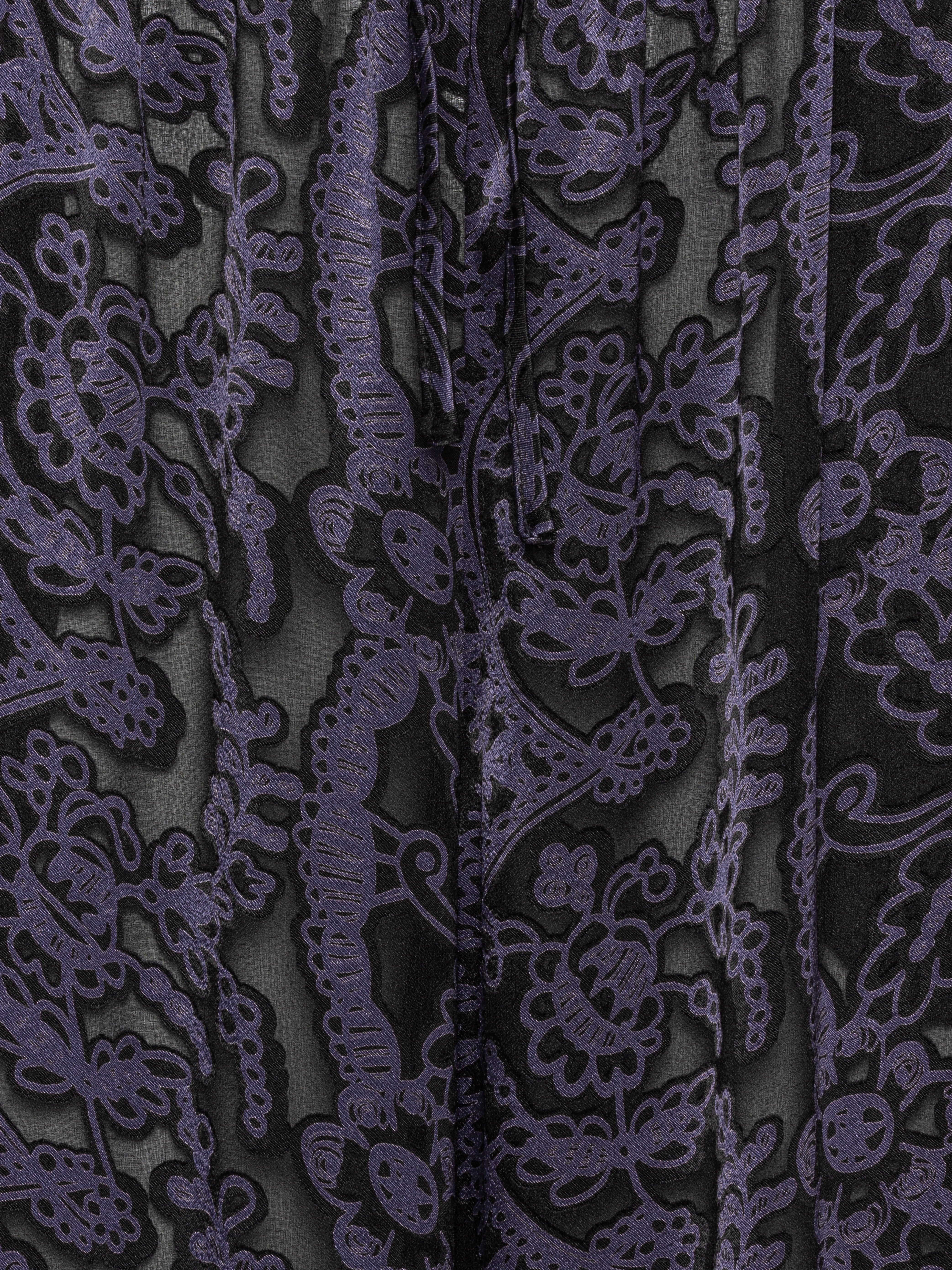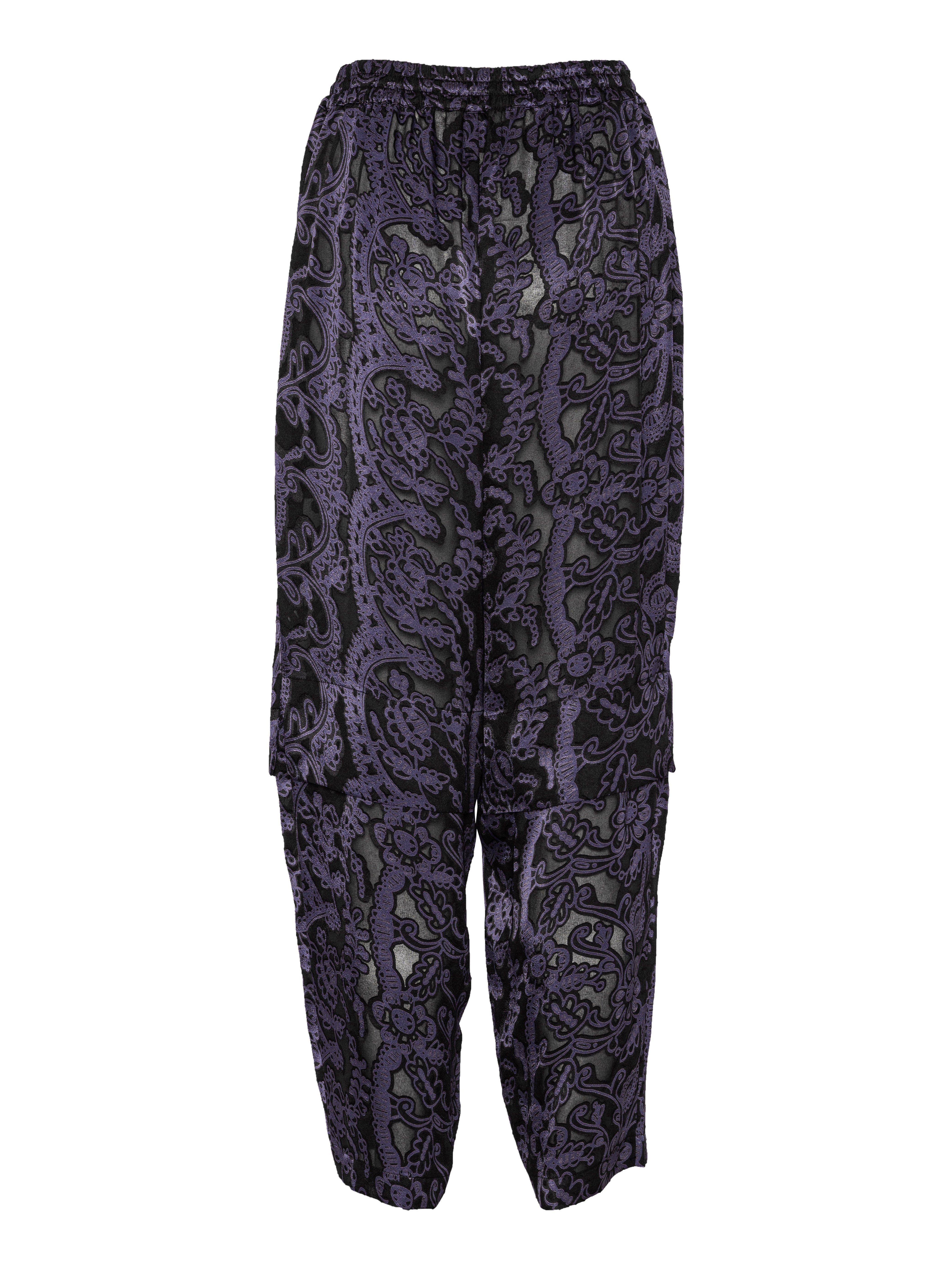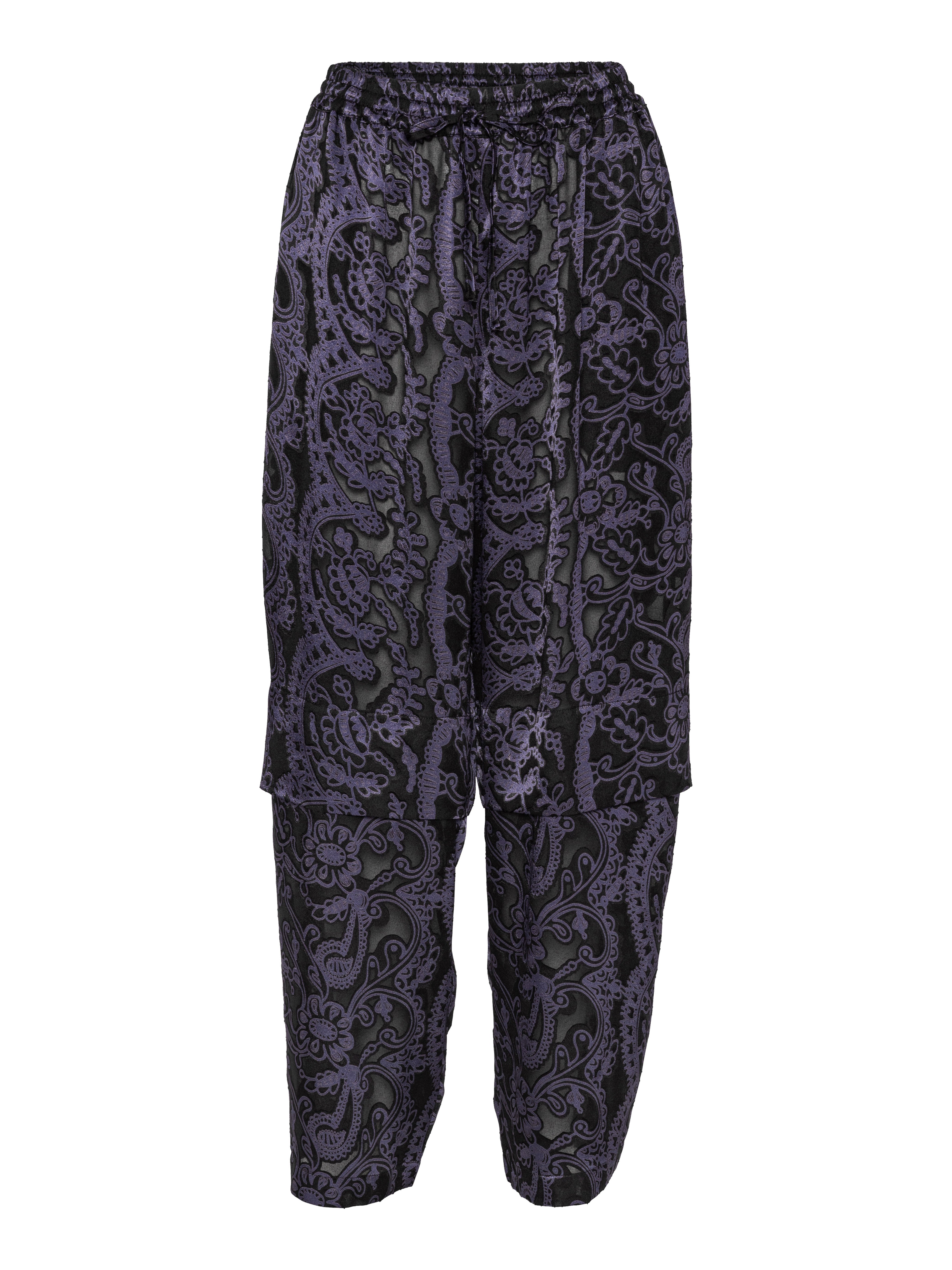 The Shants Pants are crafted in a dark purple Victorian Burnout fabric with a semi-transparent finish that adds depth and texture. Designed with an elastic waistband and drawstring for comfort, the straight, layered legs create subtle movement and dimension. A distinctive yet wearable piece from the Spring/Summer 2026 Key Collection.
